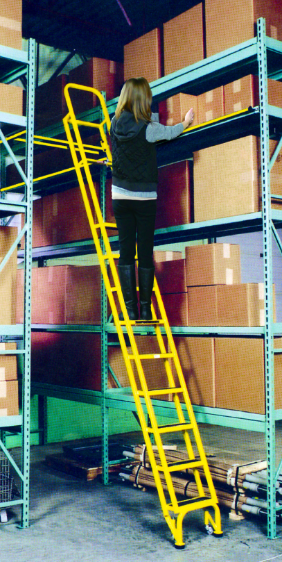 THE SINGLE TRAK™, mounted shelf ladder is designed to provide easy access to shelves in narrow aisles and cramped storage areas. These ladders have a smooth rolling upper track fixture mounted on straight track at the front shelf edge. 5″ wheels with weight actuated brakes allow easy movement of the ladder along the entire length of the track. The rugged all welded steel construction features 5″ deep by 14″ wide solid steps with abrasive treads.